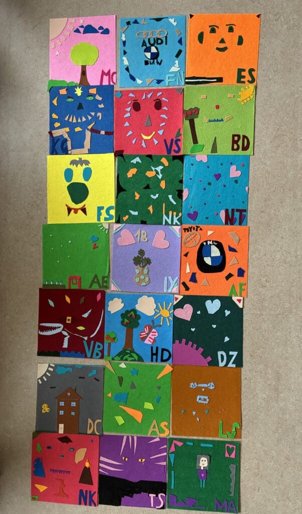 Jeder Schüler hat einen kreativen Beitrag geleistet und so ist ein ganz wunderbarer Wandteppich für die 1b Klasse entstanden.