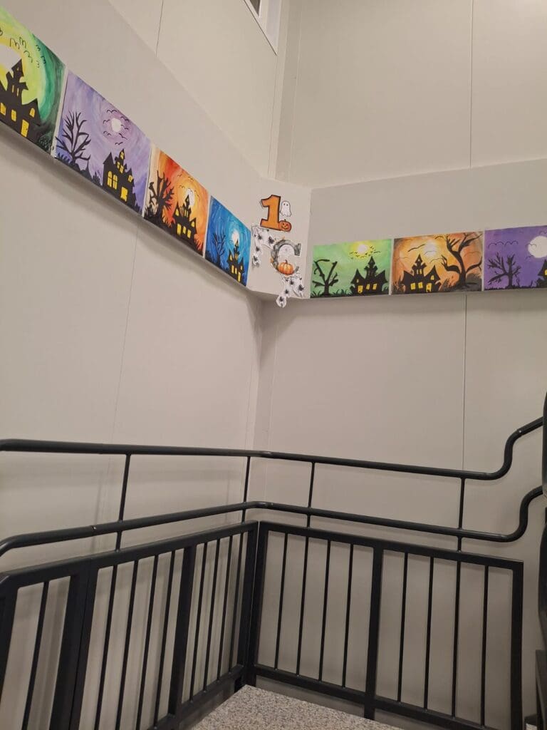 In Kunst und Gestaltung gestaltete jeder Schüler der 1c Klasse mit verschiedenen Techniken sein Geisterhaus. Die Geisterhäuser sind ein Blickfang beim Stiegenaufgang.